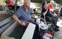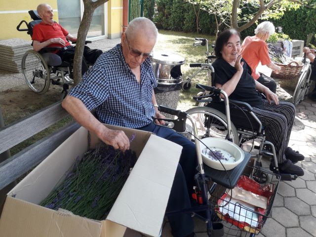 Sodelavka nam je od doma pripeljala večjo količino sivke, ki stanovalce vedno navduši, saj z njo že vrsto let izvedemo delavnico spletanja, čiščenja, dekoriranja in se razvajamo z njenim posebnim vonjem. Sivka nam je kar tri dni dišavila prostor in roke, ko smo jo spletali na dvorišču pred domom in na vrtu. To zelo prijetno opravilo je med stanovalci vzbudilo veliko zanimanja, in ker je potekalo na svežem zraku, ob igranju na harmoniko, je še dodatno koristilo našemu zdravju in počutju. Pa še obisk na štirih tačkah nas je razveselil, pocrkljat se je prišla psička z imenom Bela. Tako je bilo vzdušje in zadovoljstvo ob tem delu še lepše.
