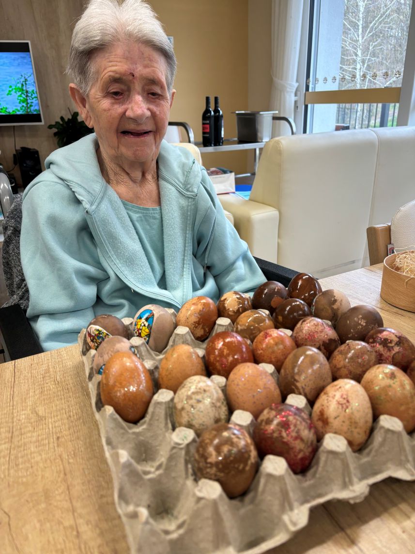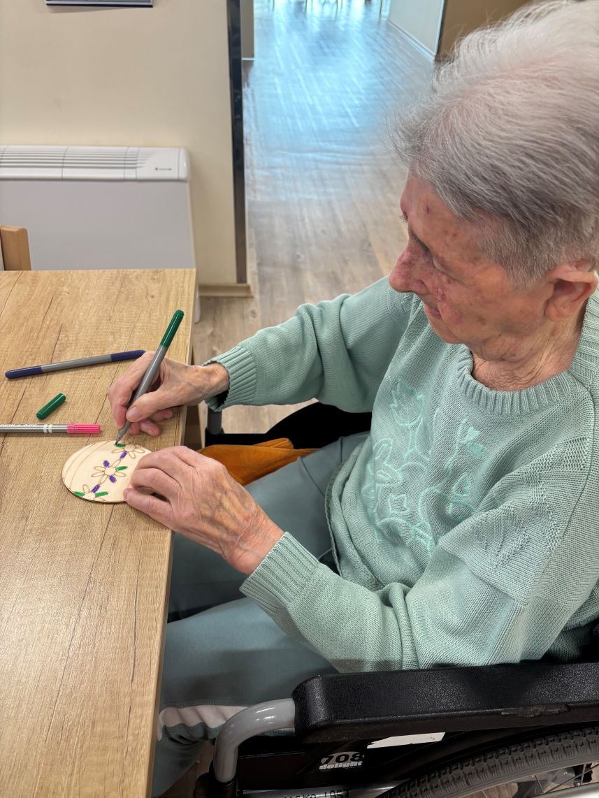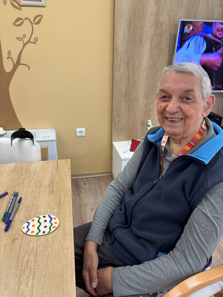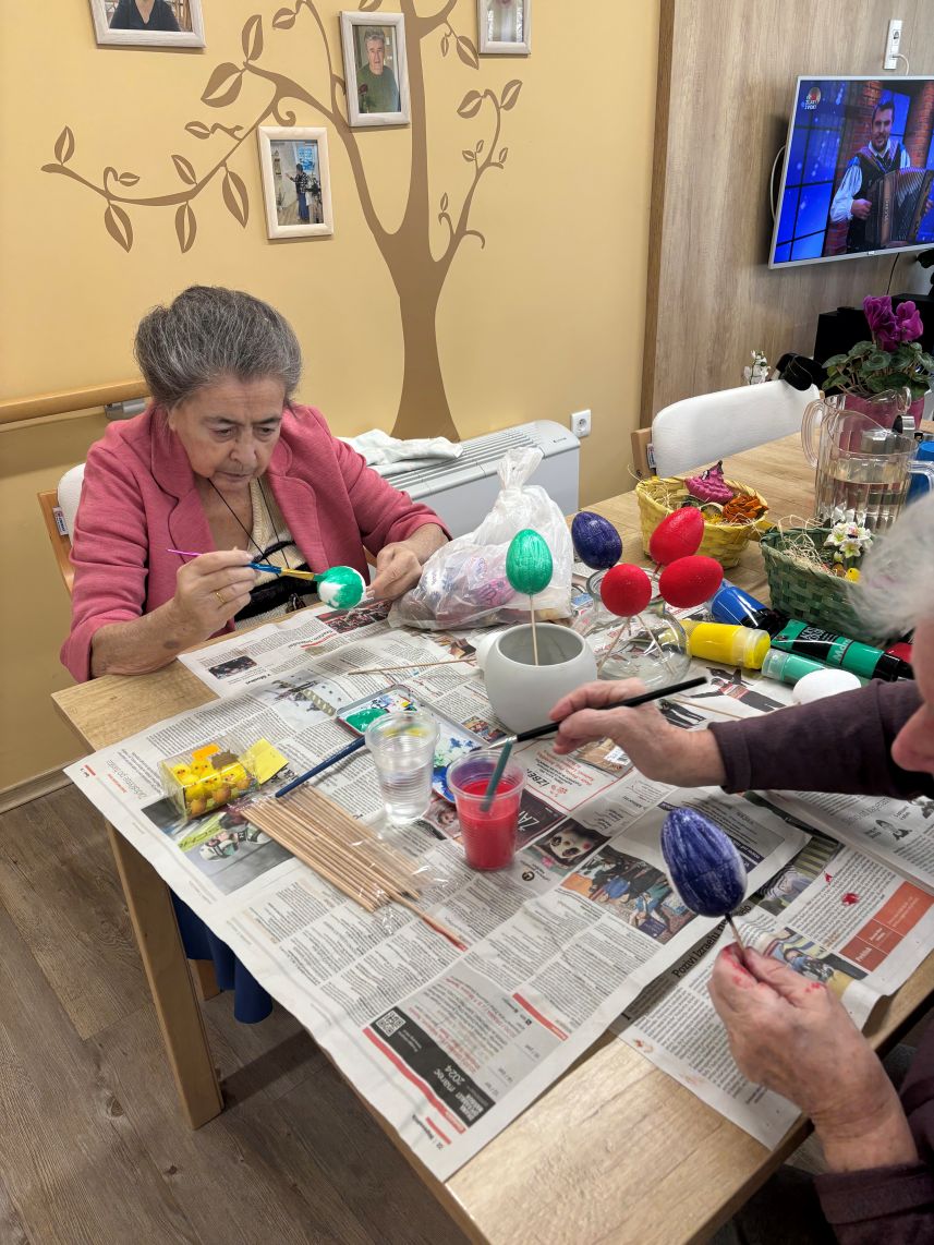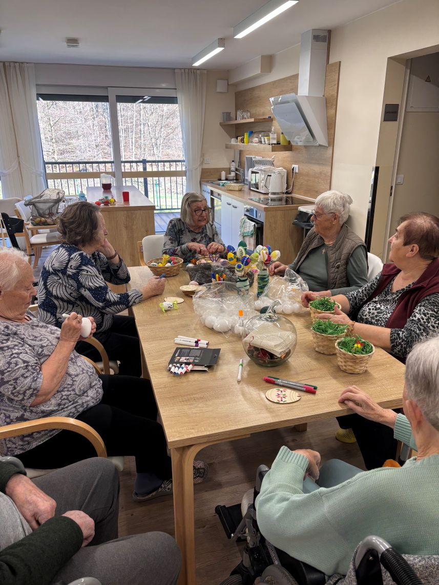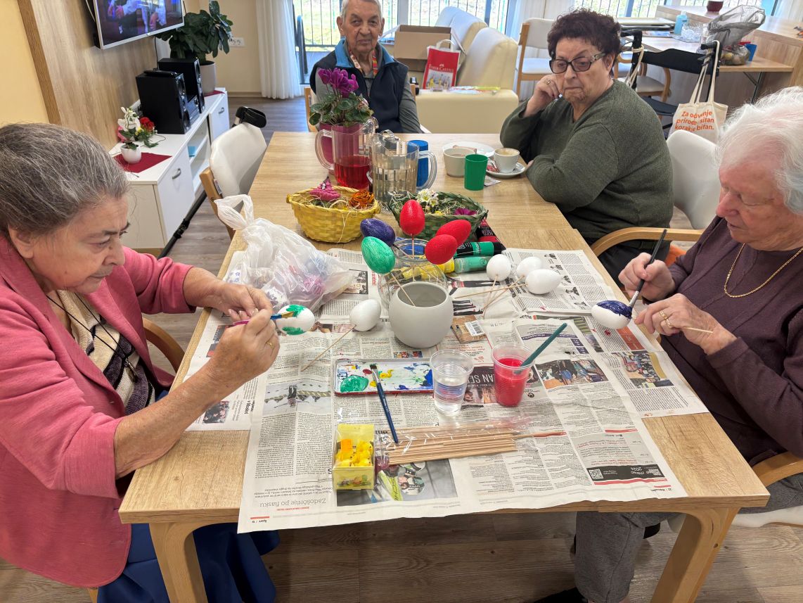 Nekaj dni pred Veliko nočjo smo pripravili velikonočno delavnico, kjer so se stanovalci lahko izkazali v svojih spretnostih in obudili otroka v sebi. Mize so bile polne različnih materialov- od barvitega papirja, različnih barv, dekorativnih okraskov in druge velikonočne dekoracije. Tukaj ne gre le za končni izdelek, temveč za druženje, obujanje običajev in urjenje ročnih spretnosti.