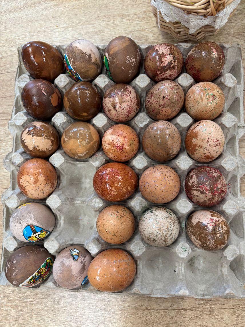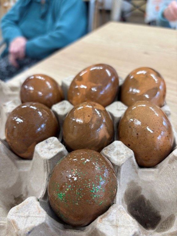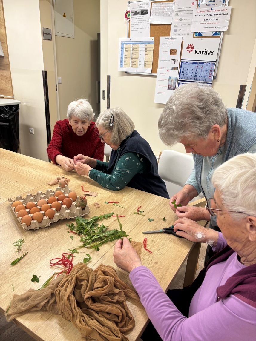Ker pa ne sme manjkati pravih pirhov, smo nekaj dni pred veliko nočjo barvali pirhe v teranu. Ta tehnika nas vedno znova fascinira, saj se na koncu zasvetijo vinski kristalčki. Nismo pa pozabili na staro ¨klasiko¨, ki zahteva mirno roko in oko za detajle. Stanovalke so prvo nabrale majhne rastline, ki so jih nastavile na jajca in jih trdno ovile z nogavico. Le te smo kuhali v čebulnih olupkih, da so dobile svojo barvo. Vsak pirh je bil unikatna umetnina, ki jo je izrisala narava sama.