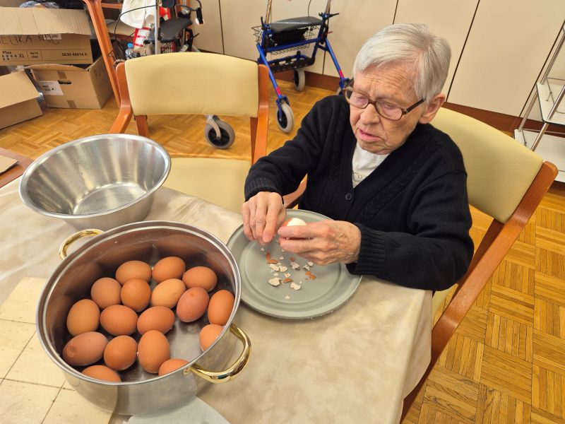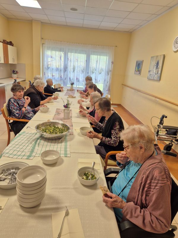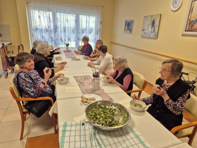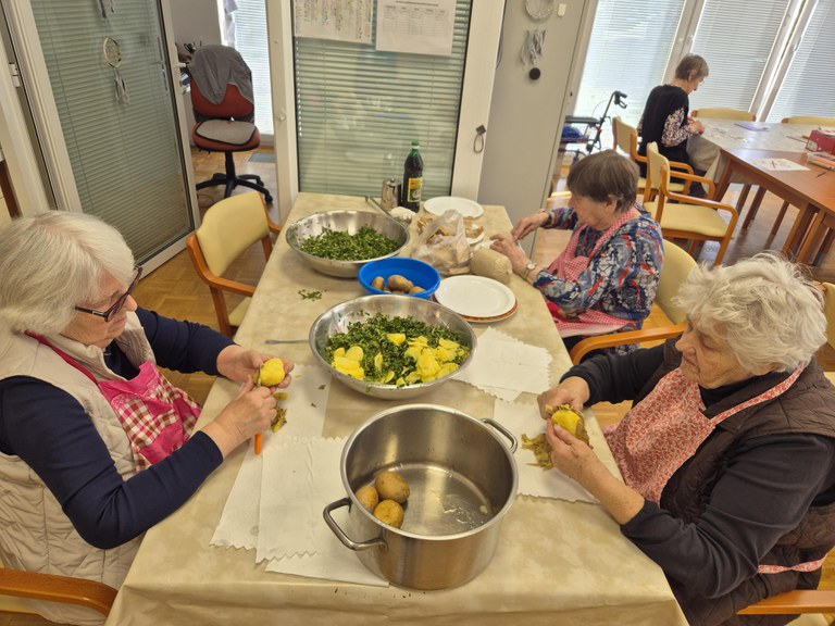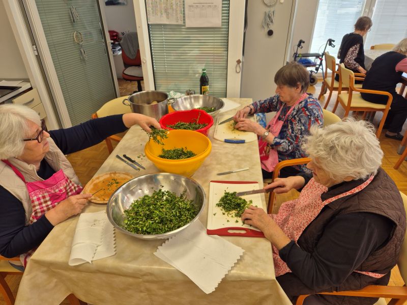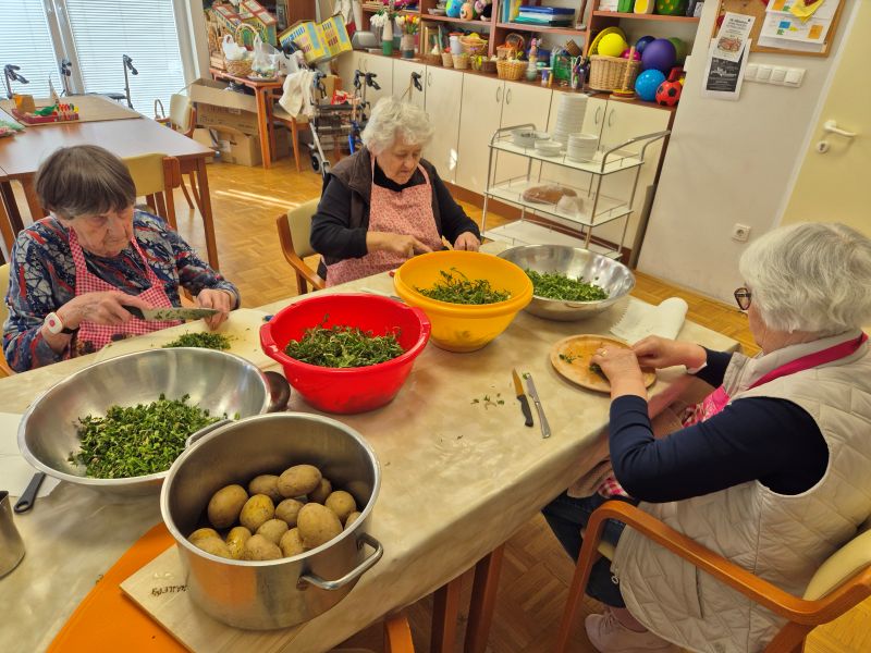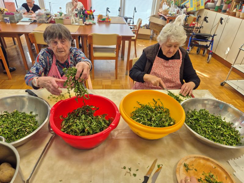 Na sončku nabran regrat ima še dodatno zdravilno moč. Skrbno očiščen in opran pa čaka na spretne roke stanovalk, da ga na drobno narežejo. Treba je bilo še skuhati jajca in krompir in ju prav tako narezati. Iz teh sestavin pa pripraviti bogato regratovo solato z nam ljubim bučnim oljem.