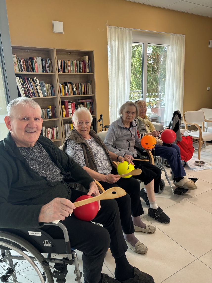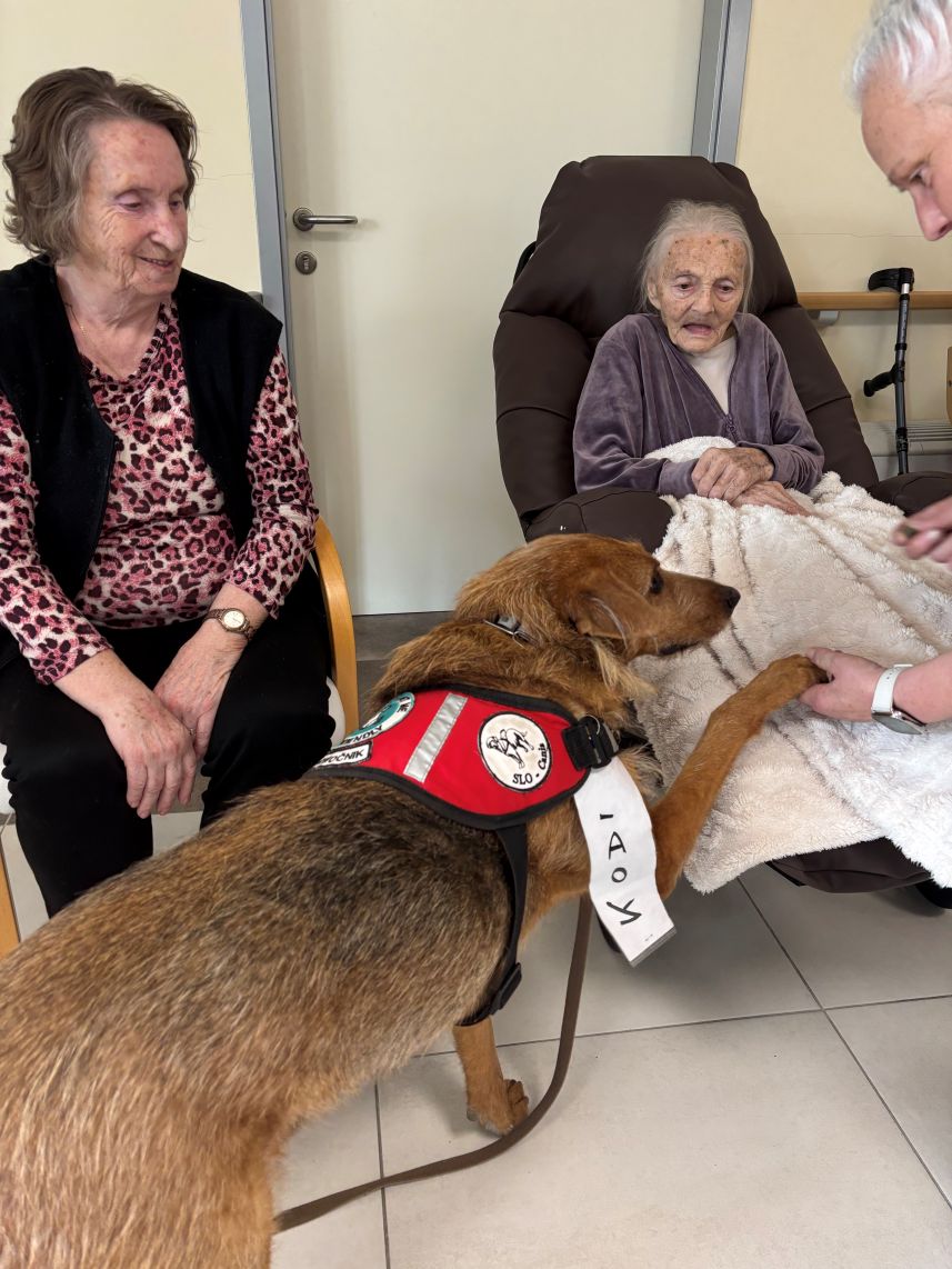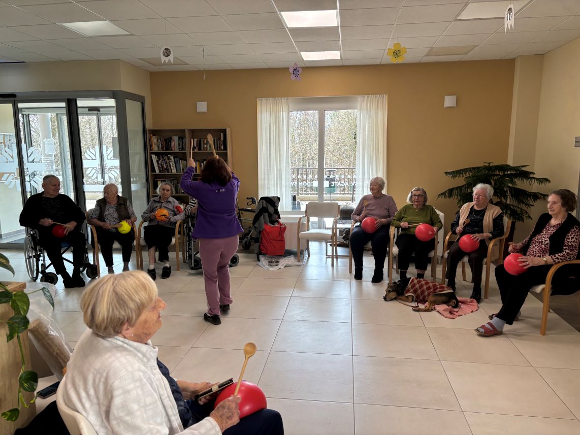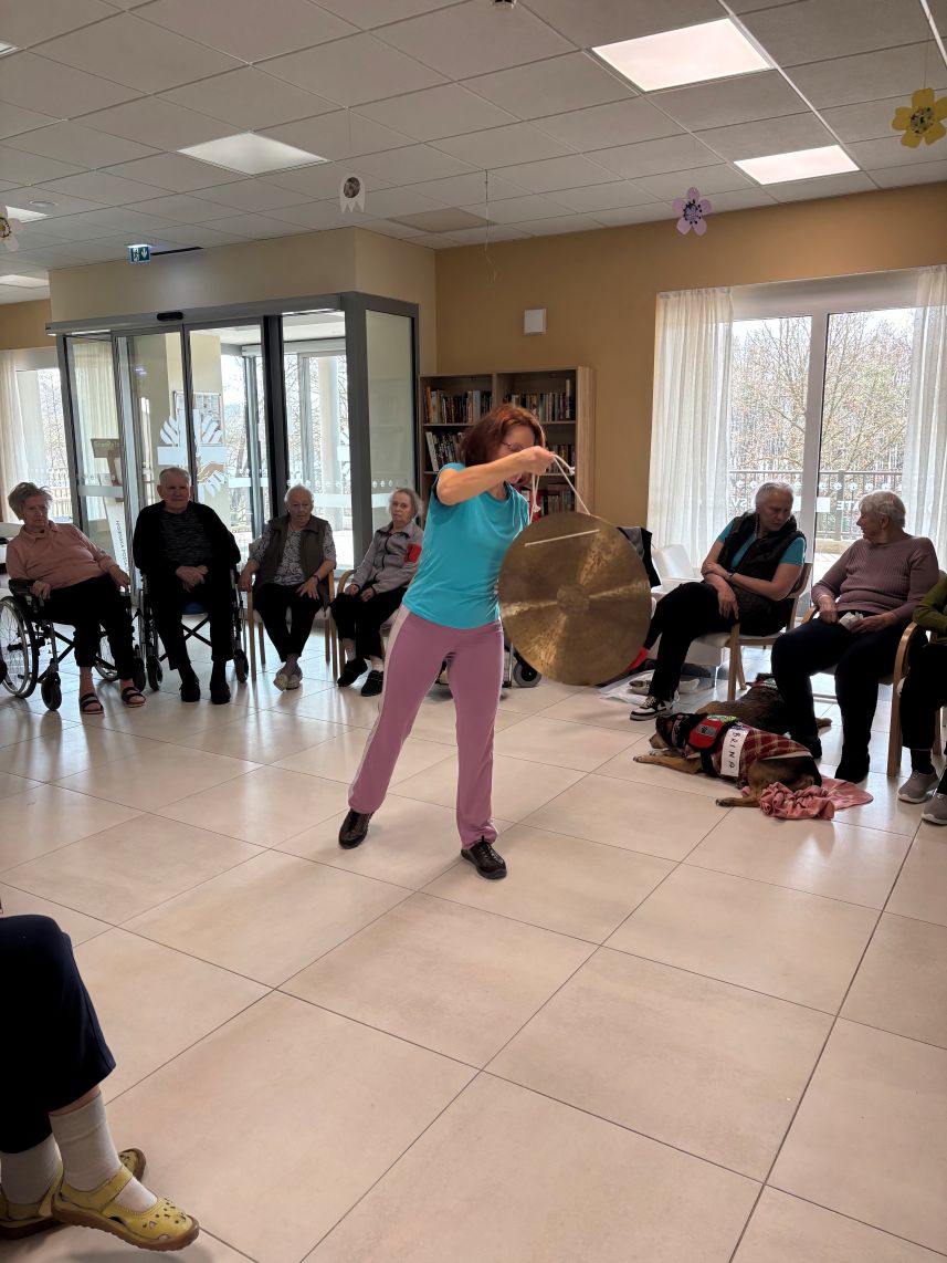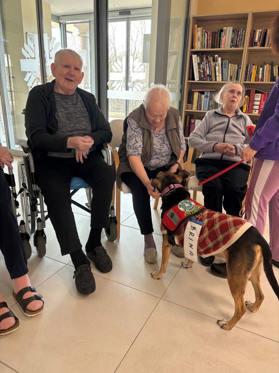 Ko skozi vrata vstopijo terapevtski psi in njihove voditeljice, se vzdušje takoj spremeni. Srečanja s kosmatinci niso le priložnost za božanje in hranjenje. Psi s svojo mirnostjo našim stanovalcem prinašajo mir, občutek sprejetosti in veselje. Ker pa voditeljice rade popestrijo našo uro druženja s seboj prinesejo razna glasbila. Le- te podelijo med stanovalce, da se lahko tudi sami preizkusijo v igranju nanje. Zvoki tolkal jih spodbudijo k gibanju, sodelovanju in ustvarjanju pozitivne energije. Na koncu pa še skupaj zapojejo znane ljudske pesmi.